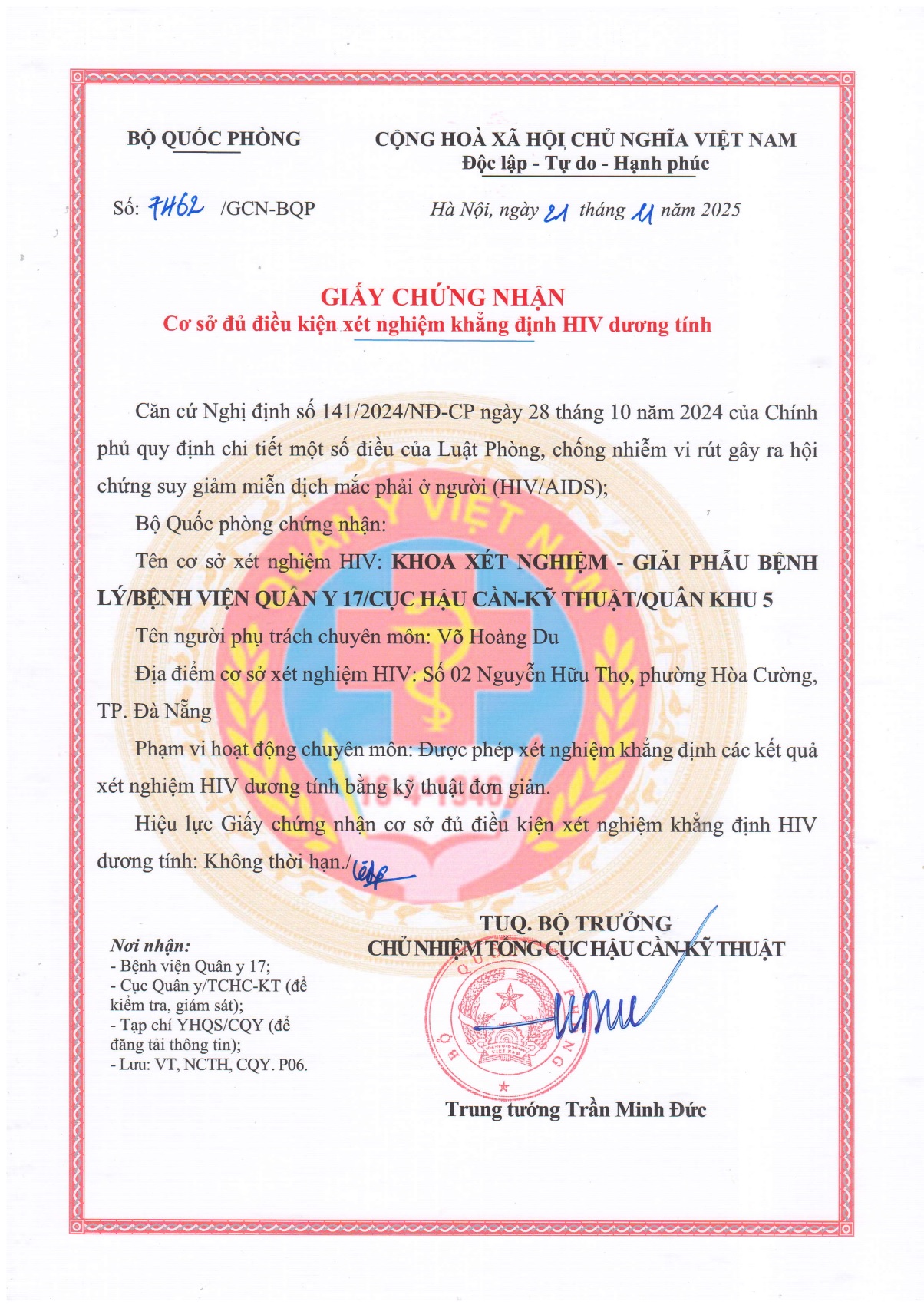 GIẤY CHỨNG NHẬN Cơ sở đủ điều kiện xét nghiệm khẳng định HIV dương tính